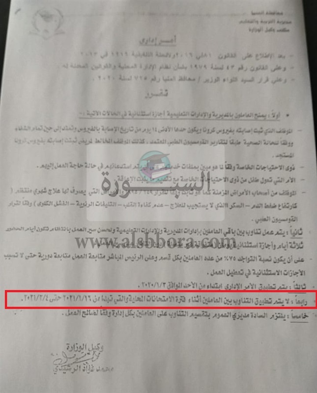 واكد فى مادته الثانية على عمل تناوب بين باقى العاملين بادارات المديرية والادارات التعليمية ولحسن سير العمل بانتظام تكون ايام الحضور ثلاثة ايام واجازة استثنائية يومين متفرقة غير متصلة دون التأثير على سير العمل، على ان يكون نسبة التواجد 75% من عدد العاملين بكل قسم وعلى الرئيس المباشر متابعة العمل متابعة دورية حتى لا تسبب الاجازات الاستثنائية فى تعطيل العمل.