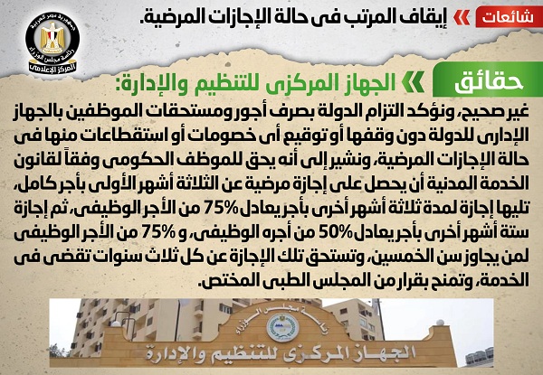انتشر في بعض المواقع الإلكترونية وصفحات التواصل الاجتماعي أنباء بشأن إيقاف المرتب في حالة الإجازات المرضية، وقد قام المركز الإعلامي لمجلس الوزراء بالتواصل مع الجهاز المركزي للتنظيم والإدارة، والذي نفى تلك الأنباء، مُؤكداً أنه لا صحة لإيقاف المرتب في حالة الإجازات المرضية، مُوضحاً التزام الدولة بصرف أجور ومستحقات الموظفين بالجهاز الإداري للدولة دون وقفها أو توقيع أي خصومات أو استقطاعات منها في حالة الإجازات المرضية، مشيراً إلى أنه يحق للموظف الحكومي وفقاً لقانون الخدمة المدنية أن يحصل على إجازة مرضية عن الثلاثة أشهر الأولى بأجر كامل، تليها إجازة لمدة ثلاثة أشهر أخرى بأجر يعادل 75 % من الأجر الوظيفي، ثم إجازة ستة أشهر أخرى بأجر يعادل 50% من أجره الوظيفي، و75% من الأجر الوظيفي لمن يجاوز سن الخمسين، وتستحق تلك الإجازة عن كل ثلاث سنوات تقضى في الخدمة، وتمنح بقرار من المجلس الطبي المختص.