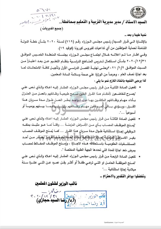 التعليم تصدر خطابا مهما الى جميع المديريات بشأن اوضاع المعلمين والاجازات الاستثنائية خلال الفترة من 2 يناير الى 20 فبراير 2021