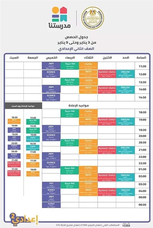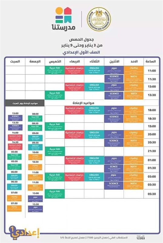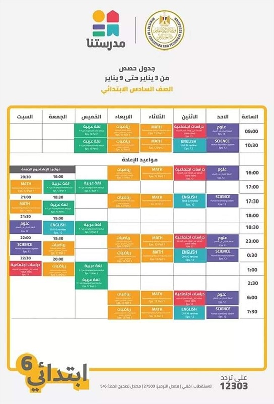 أعلنت وزارة التربية والتعليم جداول الأسبوع الثاني عشر لعرض الحصص التعليمية للمواد الأساسية (المواد داخل المجموع) من الصف الرابع الابتدائي حتى الثالث الإعدادي على القناة التعليمية "مدرستنا”، في الفترة من يوم الأحد ٣ يناير حتى السبت ٩ يناير ٢٠٢١.