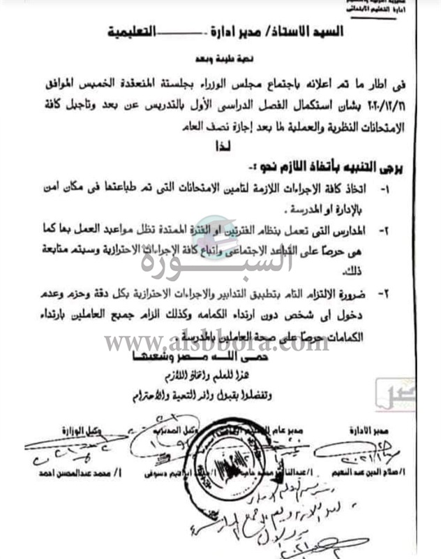 ارسلت وزارة التربية والتعليم فاكسا إلى جميع المديريات التعليميه يعمم على جميع الإدارات التعليمية وجاء ذلك فى إطار ما تم إعلانه بمجلس الوزراء بشأن استكمال الفصل الدراسى الاول بالتدريس عن بعد وتأجيل كافه الامتحانات العمليه والنظرية لما بعد اجازه نصف العام باتخاذ التنبيه بما يلى :-