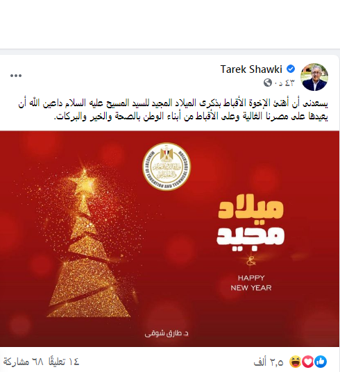 هنأ الدكتور طارق شوقي وزير التربية والتعليم، الأقباط بذكرى الميلاد المجيد وذلك في تدوينة له علي صفحتة الشخصية علي موقع التواصل الاجتماعي "فيسبوك".