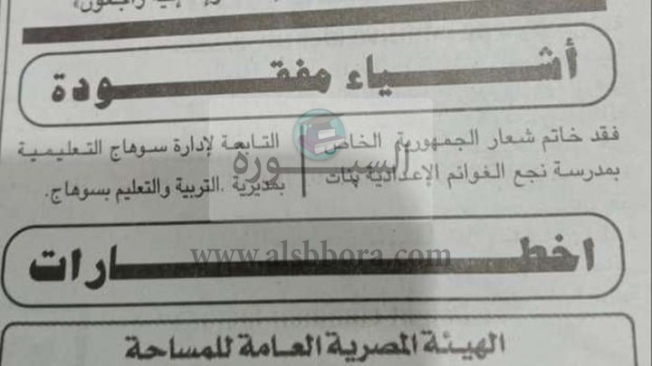 ونشرت الصحيفة فقد خاتم شعار الجمهورية الخاس بمدرسة نجع الغوانم الاعدادية بنات التابعة لادارة سوهاد التعليمية بمديرية التربية والتعليم بمحافظة سوهاج.