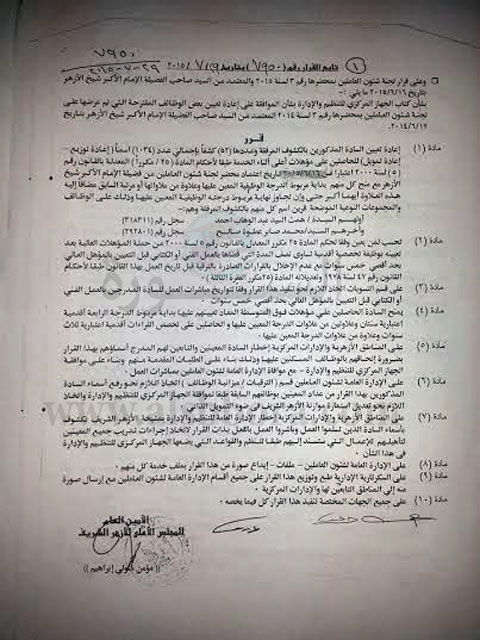 بناءا على قرار لجنة شؤن العاملين بمحضرها رقم 3 لسنة 205 والمعتمدة من الدكتور أحمد الطيب الامام الاكبر شيخ الازهر بتاريخ 16_6_.2015
