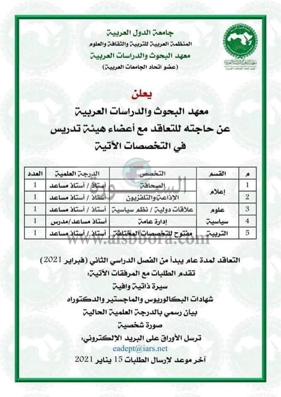 تعلن المنظمة العربية للتربية والثقافة والعلوم عن وظائف جديدة لأعضاء هيئة التدريس في 5 تخصصات وفقا لنص الإعلان التالي:-