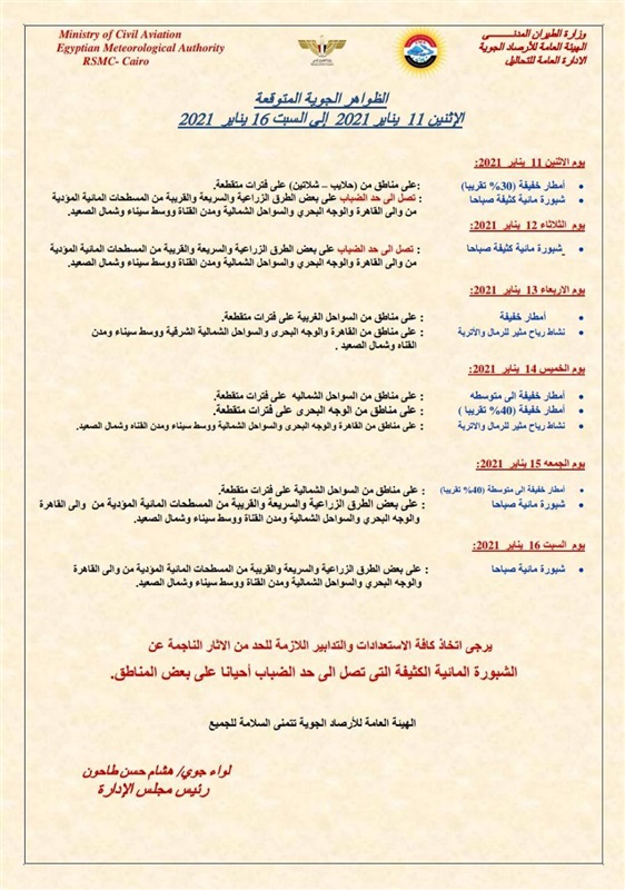 اعلنت هيئة الارصاد الجوية خريطة اماكن سقوط الامطار على مستوى الجمهورية فى الفترة من غد الاثنين الموافق 11 يناير الى السبت الموافق 16 يناير 2021، والتى جاءت كالتالى: