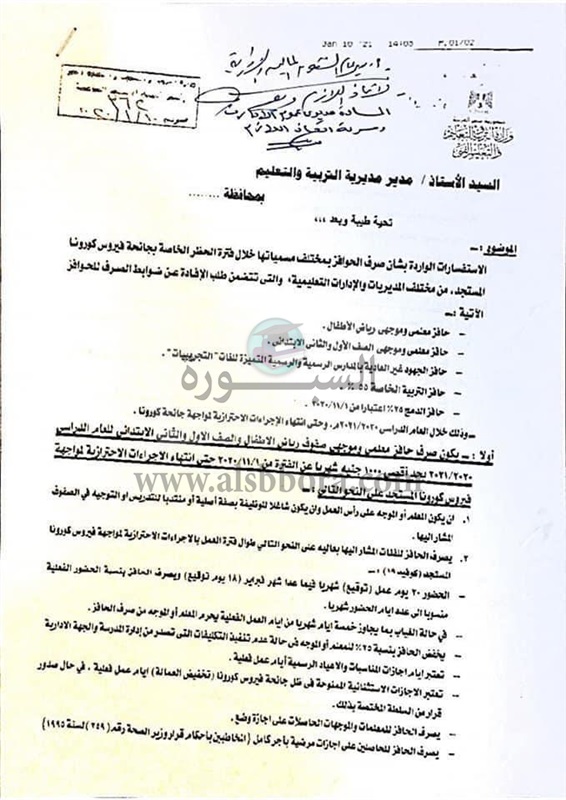 وشددت الوزارة على ضرورة صرف الحافز للمصابين بفيروس كورونا والمخالطين لمريض بفيروس كورونا والحالات المشتبه فيها بعد تقديم شهادة من اللجنة الطبية بالتأمين الصحى التابع له وجواز الجمع لمستحقى حافز رياض الأطفال وحافز الصف الأول الابتدائى وحافز الصف الثانى الابتدائى وكل من حافز المدارس الرسمية للغات وحافز الدمج.