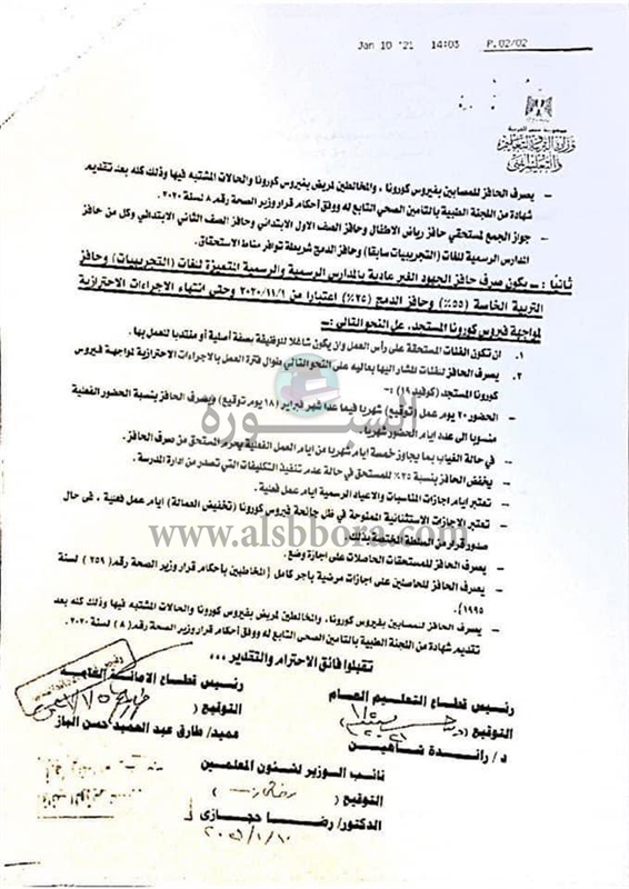 اوضحت وزارة التربية والتعليم إلى أنه في حالة الغياب بما يجاوز خمسة أيام شهريا من أيام العمل الفعلية يحرم المعلم أو الموجه من صرف الحافز، ويخفض الحافز بنسبة 25% للمعلم أو الموجه في حالة عدم تنفيذ التكيفات التي تصدر من إدارة المدرسة أو الجهة الإدارية وتعتبر أيام الإجازات المناسبات والأعياد الرسمية أيام عمل فعلية ، وتعتبر الإجازات الاستثنائية الممنوحة في ظل جائحة كورونا " تخفيض العمالة" أيام عمل فعلية في حال صدور قرار من السلطة المختصة بذلك، مع صرف الحافز للمعلمات والموجهات الحاصلات على إجازة وضع، ويصرف الحافز للحاصلين على اجازات مرضية بأجر كامل.