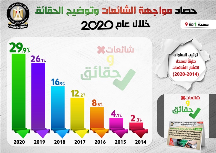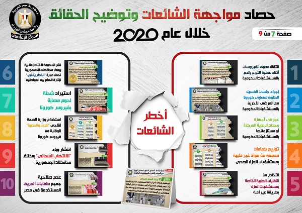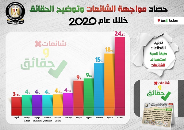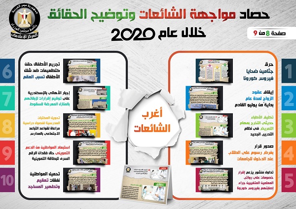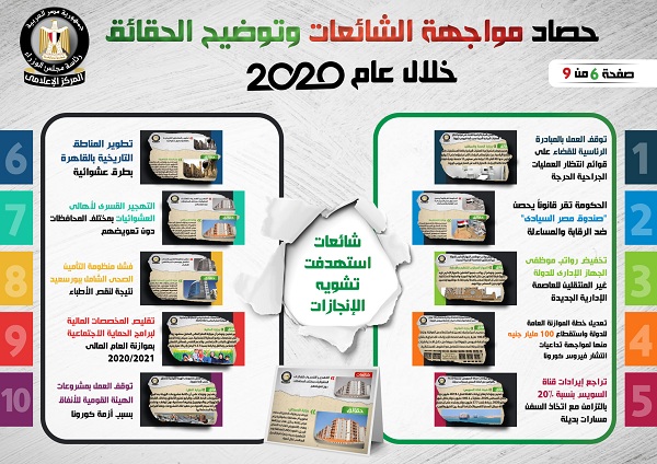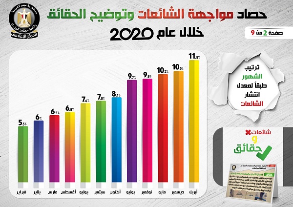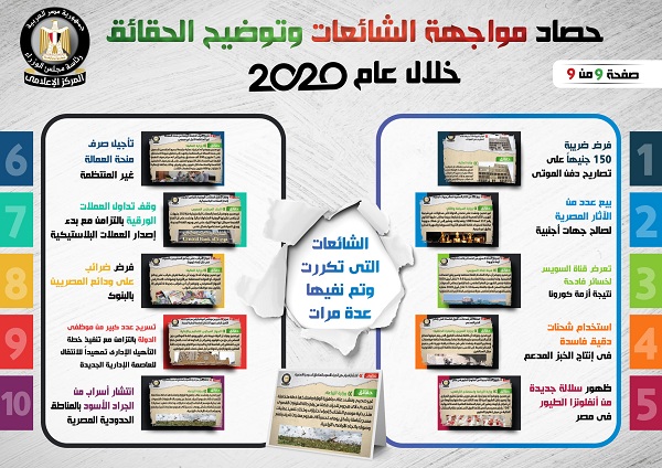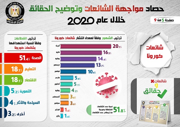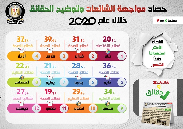 وفي هذا الصدد نشر المركز الإعلامي لمجلس الوزراء، تقريراً تضمن إنفوجرافات سلطت الضوء على حصاد مواجهة الشائعات وتوضيح الحقائق على مدار عام 2020.