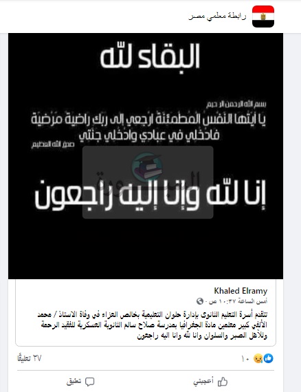 "تتقدم أسرة التعليم الثانوى بإدارة حلوان التعليمية بخالص العزاء في وفاة المعلم محمد الألفي كبير معلمين مادة الجغرافيا بمدرسة صلاح سالم الثانوية العسكرية للفقيد الرحمة وللآهل الصبر والسلوان وانا لله وانا اليه راجعون".