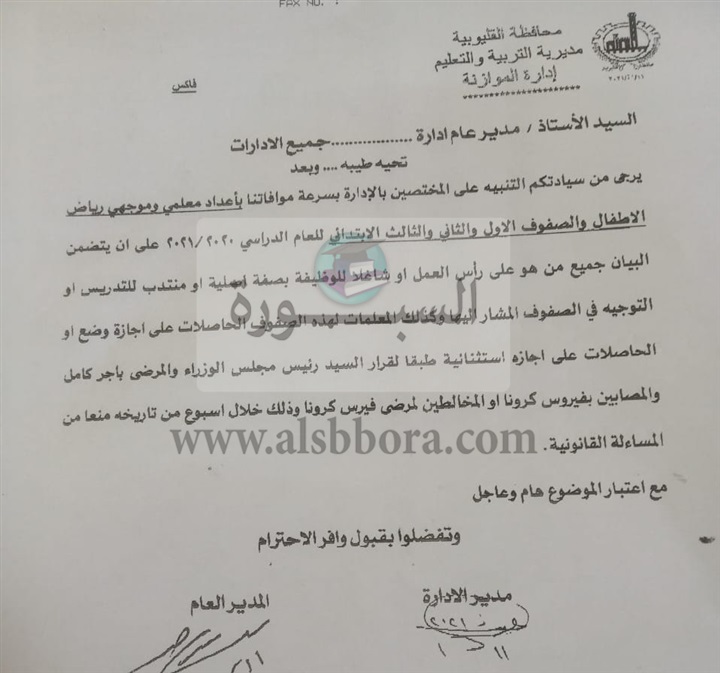 ارسلت مديرية التربية والتعليم بمحافظة القليوبية، الى جميع الادارات التعليمية، سرعة التنبيه على المختصين بالادارة موافاتنا باعداد معلمى وموجهى رياض الاطفال والصفوف الاول والثانى والثالث الابتدائى للعام الدراسى 2021/2020، على ان يتضمن البيان جميع من هو على رأس العمل او شاغلا للوظيفة بصفة اصلية او منتدب للتدريس او التوجيه فى الصفوف المشار اليها وكذلك المعلمات لهذه الصفوف الحاصلات على اجازة وضع او الحاصلات على اجازة استثنائية طبقا لقرار رئيس مجلس الوزراء والمرضى باجر كامل والمصابين بفيروس كورونا او المخالطين لمرضى فيروس كورونا وذلك خلال اسبوع من تاريخه منعا من المسائلة القانونية.