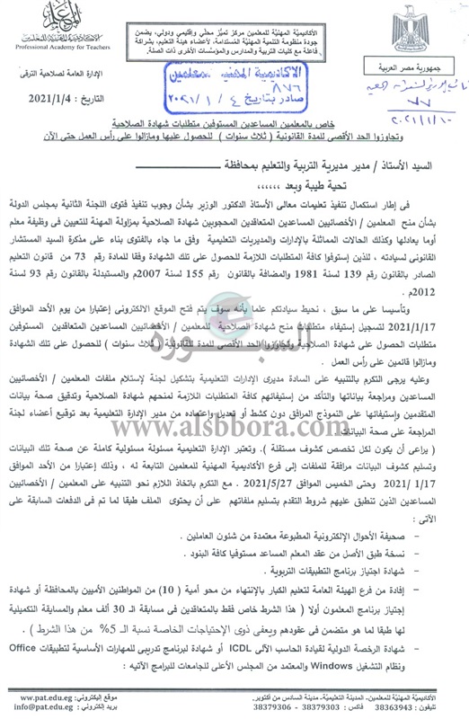 بانه سوف يتم فتح الموقع الالكترونى اعتبارا من الاحد المقبل الموافق 17 يناير لتسجيل استيفاء متطلبات منح شهادة الصلاحية للمعلمين المساعدين والاخصائيين المتعاقدين المستوفين متطلبات الحصول على شهادة الصلاحية وتجاوزوا الحد الاقصى للمدة القانونية 3 سنوات للحصول على تلك الشهادة.