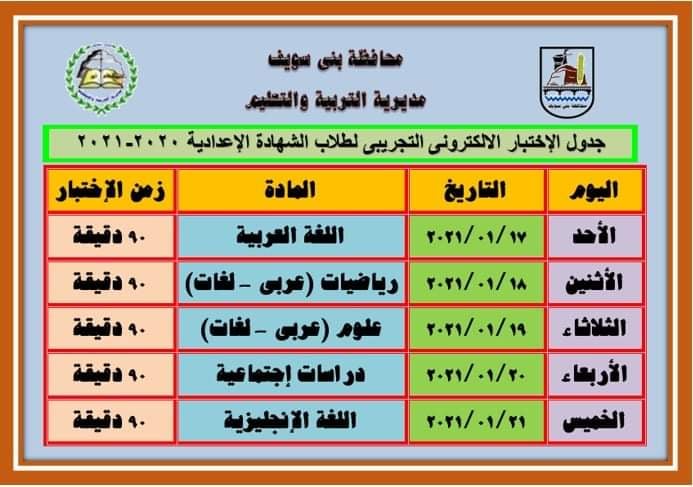 تعليم بنى سويف تعلن جدول اختبارات طلاب الشهادة الاعدادية الكترونيا.. يبدأ الاحد 17 يناير وينتهى الخميس 21 يناير