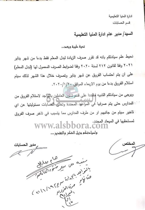 أصدت إدارة المنيا التعليمية، أمر إداري بشأن صرف الزيادة لبدل المعلم خلال يناير الجاري علي أن يبدأ استلام الفروق الأربعاء المقبل.