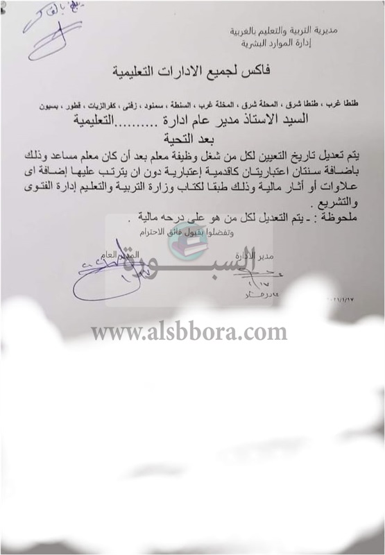 ارسلت مديريه التربيه والتعليم بالغربية للأدارات التعليمية فاكسا بتعديل تاريخ التعيين لكل من شغل وظيفة معلم بعد ان كان معلم مساعد باضافة سنتان اعتباريتان كأقدمية اعتبارية دون ان يترتب عليهما اي اضافة اي علاوات او اثار مالية وذلك طبقا لكتاب وزارة التربية والتعليم ادارة الفتوى والتشريع