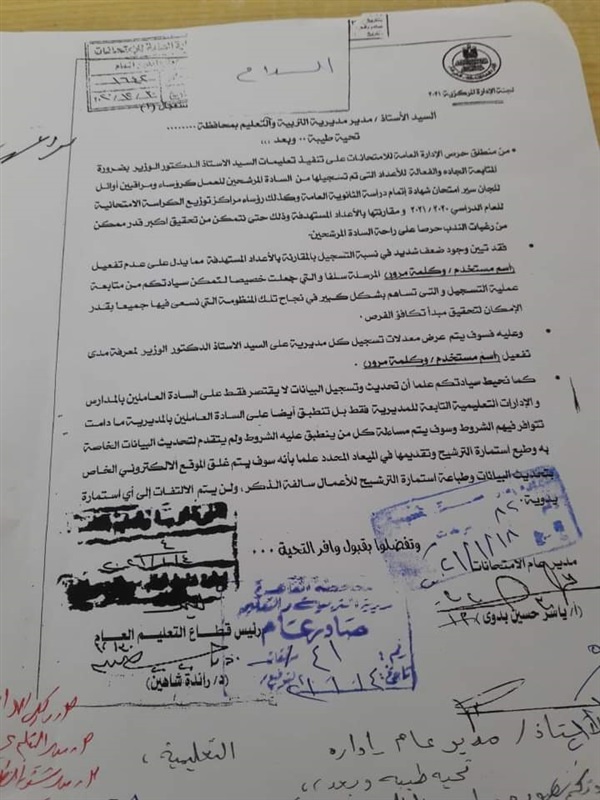 التربية والتعليم توجه تحذير شديد اللهجة الى جميع المعلمين المتقاعسين فى التسجيل والاشتراك فى اعمال امتحانات الثانوية العامة 2021/2020.. واحالتهم الى التحقيق.. مستند