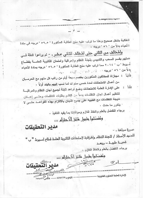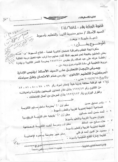 جاء ذلك خلال الشكوى التي قدمت لوزير التربية والتعليم، ومحافظ أسيوط، ورئيس النيابة الإدارية، ضد وكيل الكنترول، عقب استبعاد البعض من لجنة التظلمات، والاستعانة بمجموعة إشراف حصلوا على جزاءات التظلمات العام الماضي، لقيامهم بالتلاعب في كراسات إجابة بعض الطلاب المتظلمين للرفع من درجاتهم.