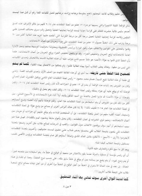 يذكر أن 12 عضوًا من لجنة تظلمات 2014، تمت مجازاتهم عقب تلاعبهم في أوراق إجابة إحدى التلميذات واستبدالها بكراسة أخرى، وتم حرمانهم من أعمال الامتحانات، فضلًا عن أن الطالبة التي تم التلاعب لحسابها، تمتد بصلة قرابة لـ«حسام محمد محمود» رئيس لجنة التظلمات العام الماضي ووكيل الكنترول العام الحالي، بحسب مقدمي الشكوى، وقد عاد الأعضاء المجازين للعمل باللجنة أثناء فترة الامتحانات في الأسبوع الثاني.