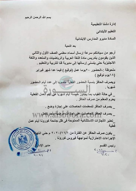 أصدرت إدارة دشنا التعليمية محافظة قناتعليمات تحرير حافز رياض الاطفال ومعلمى الصف الاول والثاني الابتدائي