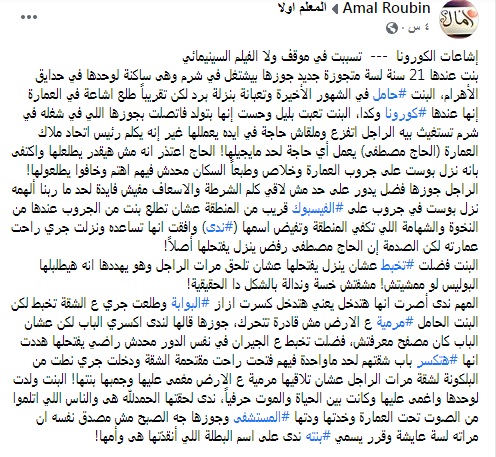 نت عندها 21 سنة لسة متجوزة جديد جوزها بيشتغل في شرم وهى ساكنة لوحدها في حدايق الأهرام، البنت حامل في الشهور الأخيرة وتعبانة بنزلة برد لكن تقريباً طلع اشاعة في العمارة إنها عندها كورونا وكدا، البنت تعبت بليل وحست إنها بتولد فاتصلت بجوزها اللي في شغله في شرم تستغيث بيه الراجل اتفزع وملقاش حاجة في ايده يعمللها غير إنه يكلم رئيس اتحاد ملاك العمارة (الحاج مصطفى) يعمل أي حاجة لحد مايجيلها! الحاج اعتذر انه مش هيقدر يطلعلها واكتفى بانه نزل بوست على جروب العمارة وخلاص وطبعاً السكان محدش فيهم اهتم وخافوا يطلعولها! ا.