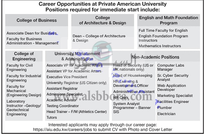 تعلن الجامعة الامريكية بالكويت عن حاجتها الى اعضاء هيئة التدريس ومعاونيهم، وعلى الراغبين فى الحصول على الوظيفة ارسال السيرة الذاتية عبر الايميل المنشور فى الاعلان التالى:
