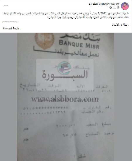 وقال يوسف "دا مرتب معلم فى شهر 1/2021 يعيش أسرة من خمس افراد علشان كل الناس بتتكلم على زيادة مرتبات المدرسين والمشكلة ان لو فيه شغل اضافى فهو واقف علشان الكرونا والحمد لله مبنديش دروس سترك ورضاك يا رب"