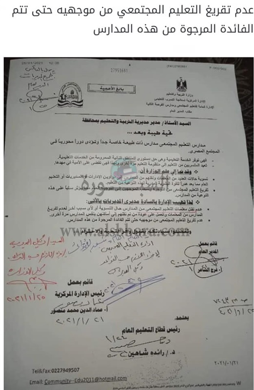 أصدرت وزارة التربية والتعليم والتعليم الفني خطابا رسميا عممته على جميع المديريات التعليمية على مستوي الجمهورية بشأن عدم نقل من يعمل بالتعليم المجتمعي، وعودة من تم نقلهم إلى مدارسهم مرة أخرى.