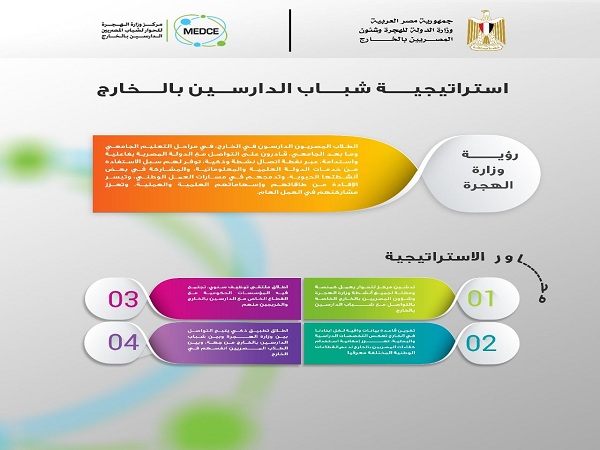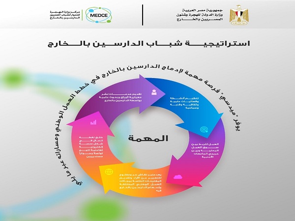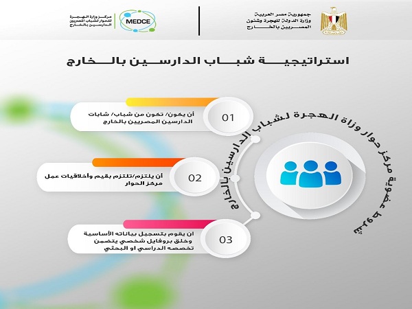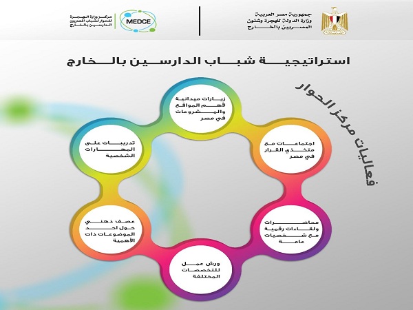 ويعد مركز وزارة الهجرة للحوار لشباب الدارسين بالخارج MEDCE هو الأول من نوعه في مصر والمنطقة ويعمل على توفير خدمات وأنشطة متعددة مع الطلاب المصريين الدارسين بالخارج واستدامة التواصل معهم، من خلال إطلاق منصة تفاعلية كاملة للمركز تستهدف جميع المصريين الدارسين بالخارج، لدعم وطنهم معرفيا وبحثيا سواء اختاروا العودة إلى البلاد أو العمل خارجها، وليكونوا حائط صد قوي ضد محاولات الاستقطاب السياسي والثقافي لشباب الدارسين بالخارج.