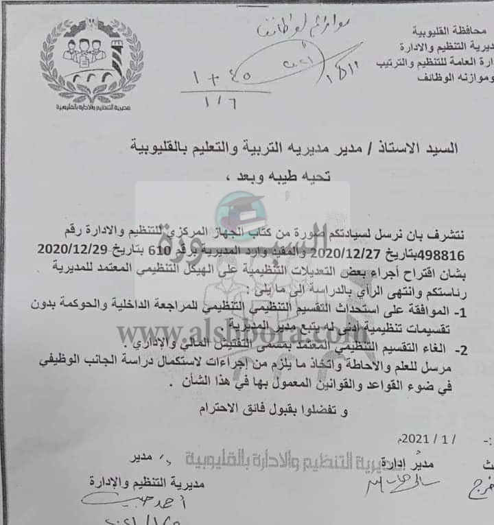 وأشار القرار إلي صورة من كتاب الجهاز المركزي للتنظيم والادارة رقم 498816 بتاريخ 2020/12/27 والمقيد وارد المديرية برقم 610 بتاريخ 2020/12/29 بشان اقتراح اجراء بعض التعديلات التنظيمية على الهيكل التنظيمي المعتمد للمديرية.