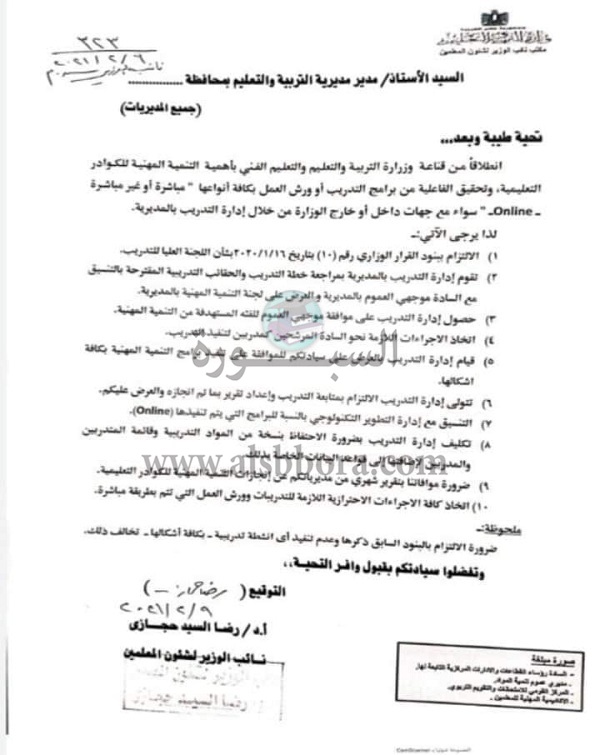انطلاقا من وزارة التربية والتعليم والتعليم الفني، بشأن التنمية المهنية للكوادر التعليمية، وتحقيق الفعالية من برامج التدريب أو ورش العمل بكافة أنواعها مباشرة أو غير مباشرة online سواء مع جهات داخل أو خارج الوزارة من خلال إدارة التدريب بالآتي: