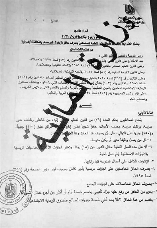 اصدرت وزارة المالية القرار الوزارى رقم 34 لسنة 2021 بشأن الضوابط واللوائح الحاكمة والمنظمة وصرف حافز الادارة المدرسية والمكافآت الاضافية عن امتحانات النقل.