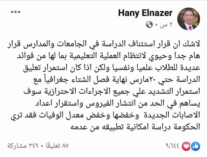 واضاف خلال بوست له على صفحته الرسمية بموقع التواصل الاجتماعى فيسبوك "لاشك ان قرار استئناف الدراسة في الجامعات والمدارس قرار هام جدا وحيوي لانتظام العملية التعليمية بما لها من فوائد عديدة للطلاب علميا ونفسيا ولكن اذا كان استمرار تعليق الدراسة حتي ٢٠مارس نهاية فصل الشتاء جغرافياً مع استمرار التشديد علي جميع الاجراءات الاحترازية سوف يساهم في الحد من انتشار الفيروس واستقرار اعداد الاصابات الجديدة وخفضها وخفض معدل الوفيات فقد تري الحكومة دراسة امكانية تطبيقه من عدمه".