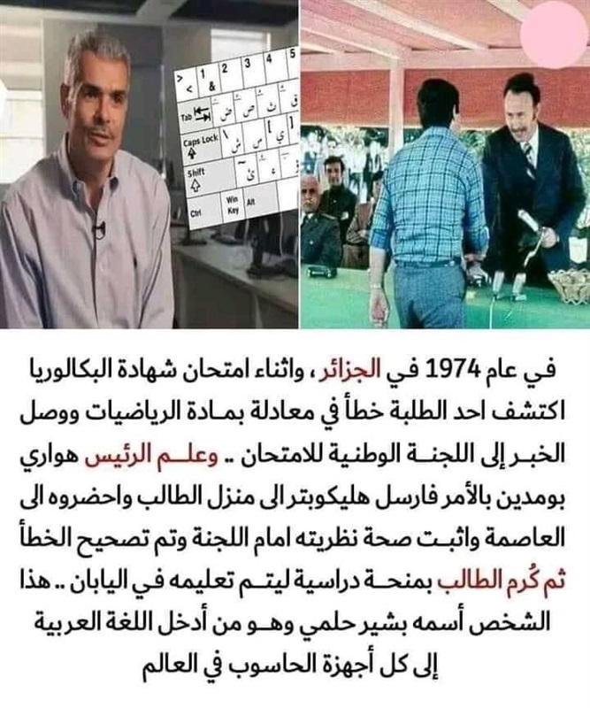 في عام 1974 في الجزائر واثناء امتحان شهادة البكالوريا اكتشف أحد الطلبة خطأ في معادلة بمادة الرياضيات ووصل الخبر الي اللجنة الوطنية للامتحانات وعلم الرئيس الهواري بوميدين بالأمر فارسل هليكوبترالي منزل الطالب واحضروه الي العاصمة.
