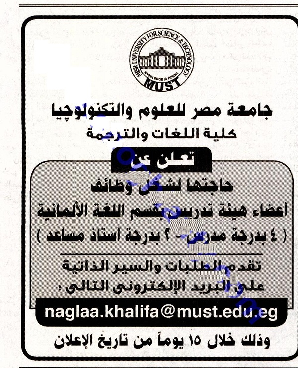 تعلن جامعة مصر للعلوم والتكنولوجيا، عن حاجتها الى اعضاء هيئة التدريس ومعاونيهم، وعلى الراغبين فى الحصول على الوظيفة، ارسال السيرة الذاتية، عبر الايميل المنشور فى اعلان جريدة الاهرام، امس الاحد، الموافق 14 فبراير 2021، على ان تقدم الطلبات خلال 15 يوما، من تاريخ نشر الاعلان.