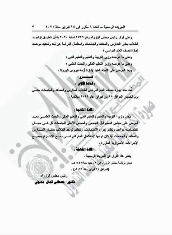 وجاء نص المادة الاولى من القرار ان تمد مدة اجازة نصف العالم الدراسى لطلاب المدارس والجامعات حتى يوم الخميس الموافق 25 فبراير 2021.