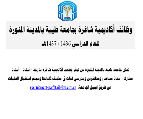 تعلن جامعة طيبة بالمدينة المنورة عن توفر وظائف أكاديمية شاغرة بدرجة ( أستاذ – أستاذ مشارك - أستاذ مساعد )ومحاضرين ومدرسي لغات في مختلف كلياتها.