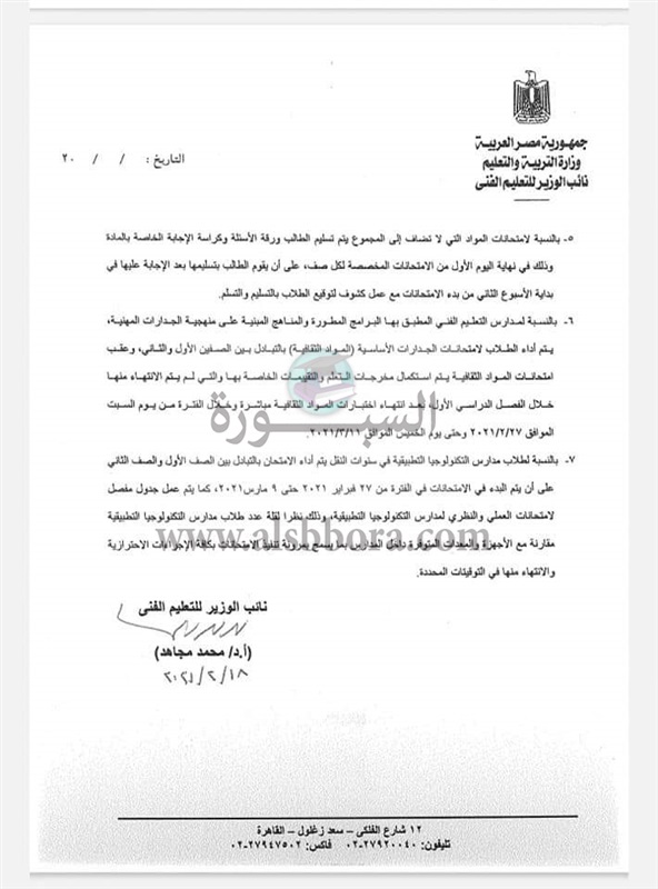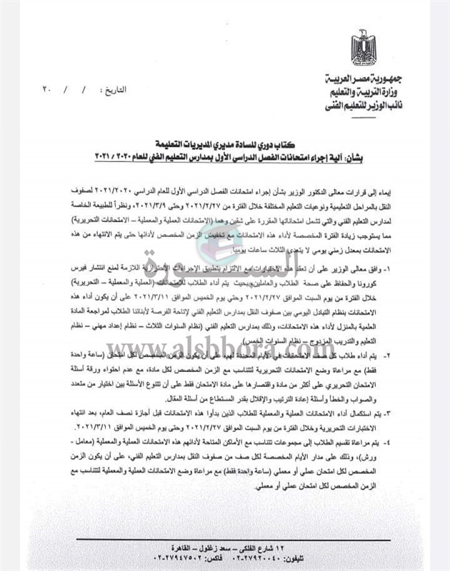 اصدرت وزارة التربية والتعليم والتعليم الفنى، الكتاب الدورى، الخميس الموافق 18 فبراير 2021، بشأن الية اجراء امتحانات الفصل الدراسى الاول بمدارس التعليم الفنى للعام الدراسى 2021/2020.