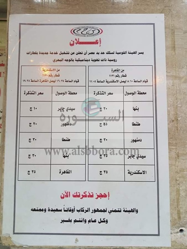 تعلن الهيئة القومية لسكك حديد مصر عن تشغيل خدمة جديدة بقطارات روسية بالوجه البحرى، ذات تهوية ديناميكية، على ان تكون رحلة القطار من القاهرة الى الاسكندرية وبالعكس، وتستغرق الرحلة ثلاث ساعات الا خمس دقائق.