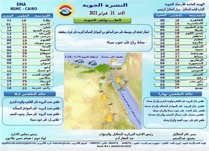 أعلنت هيئة الارصاد المصرية عن حالة الطقس اليوم الاثنين 22-2-2021، حيث أشارت إلى منخفض جوي بالقرب من سواحل مطروح والسلوم يعمل على تكون السحب الممطرة تكون متوسطة إلى غزيرة الشدة يصاحبها البرق والرعد احيانا ويتساقط معها كرات البرد ثم يتحرك المنخض الجوي إلى الاسكندرية بعد الظهر.