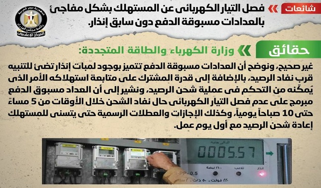 وتواصل مركز المعلومات مع وزارة الكهرباء والطاقة بشأن ما تم تداوله من فصل التيار الكهربائى عن العدادات مسبوقة الدفع بدون سابق انذار، والتى نفت هذه الاخبار، مؤكدة انها عارية تماما من الصحة.