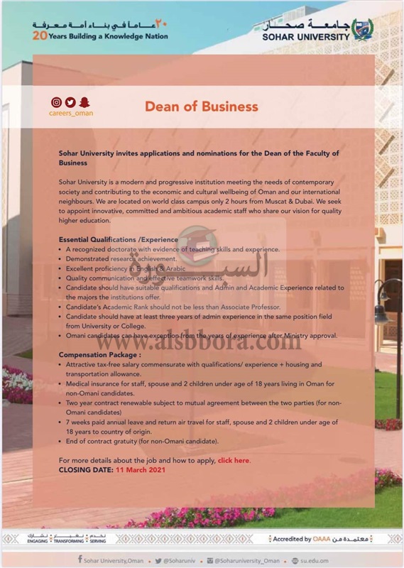 أعلنت جامعة صحار العمانية عن وظائف جديدة شاغرة، علما بأن أخر موعد للتقديم 15 مارس.