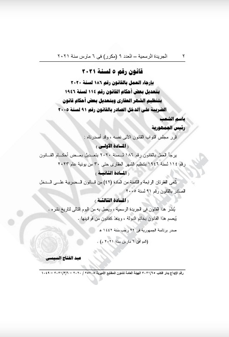 وافق الرئيس عبد الفتاح السيسي، رئيس الجمهورية، على القانون رقم 5 لسنة 2021 بإرجاء العمل بالقانون ١٨٦ لسنة ٢٠٢٠ بتعديل بعض أحكام القانون رقم ١١٤ لسنة ١٩٤٦ بتنظيم الشهر العقاري، وبتعديل بعض أحكام قانون الضريبة علي الدخل الصادر بالقانون رقم ٩١ لسنة ٢٠٠٥، والذي وافق عليه مجلس النواب.