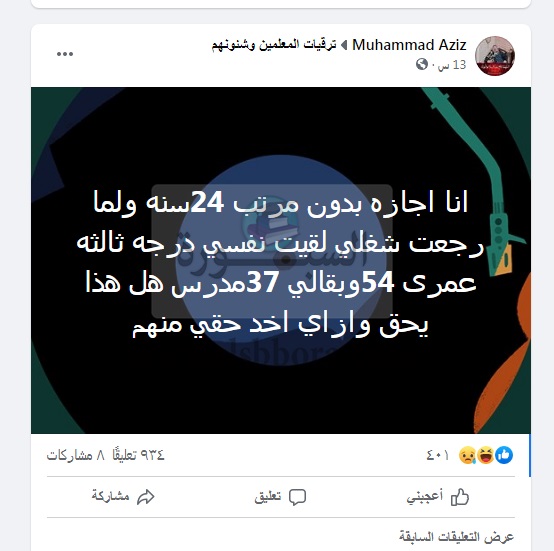قال محمد عزيز، معلم في التربية والتعليم، في تدوينة له علي جروب ترقيات المعلمين وشئونهم، علي موقع فيسبوك، "انا اجازه بدون مرتب 24سنه ولما رجعت شغلي لقيت نفسي درجه ثالثه عمرى 54وبقالي 37مدرس هل هذا يحق وازاي اخد حقي منهم".
