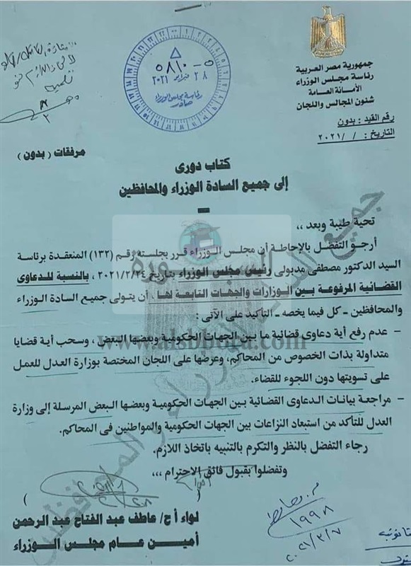 أصدر مجلس الوزراء كتاب دوري جديد إلى جميع الوزراء والمحافظين تضمن الآتي: