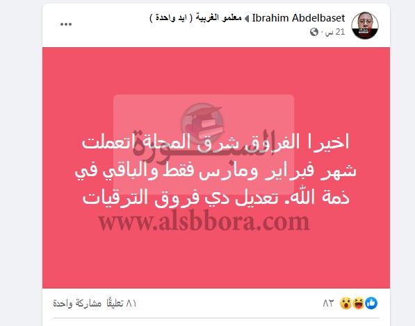 قال المعلم إبراهيم عبد الباسط في تدوينة له علي جروب معلمو الغربية "ايد واحدة"، علي موقع فيسبوك، والذي يعمل في إحدي مدارس مدينة المحلة اخيرا الفروق شرق المحلة اتعملت شهر فبراير ومارس فقط والباقي في ذمة الله. تعديل دي فروق الترقيات.
