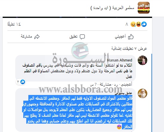 قالت عشق بسيوني معلمة بالإسكندرية، في تدوينه لها علي جروب «معلمو الغربية ايد واحدة» علي موقع فيسبوك، إن معلمي المواد للصفوف الاوليه فقط لهم الحافز ومعلمي الانشطه الي مطالبين بالاشتراك في المسابقات علي مستوي الادارة والمحافظة وجمهوري ليس لهم حافز.