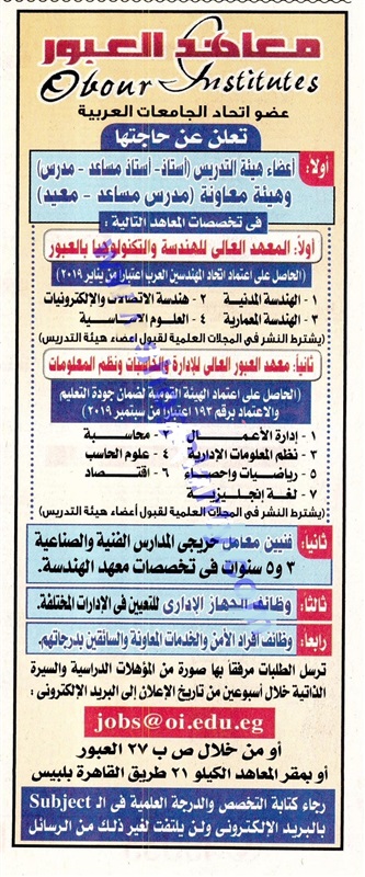 تعلن معاهد العبور عن حاجتها الى اعضاء هيئة التدريس من المعيد الى الاستاذ فى معهدى العالى للهندسة والتكنولوجيا والعبور العالى للادارة والحاسبات ونظم المعلومات.
