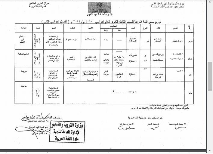 اعلن مركز تطوير المناهج قسم اللغة العربية بوزارة التربية والتعليم عن توزيع منهج اللغة العربية لطلاب وطالبات الصف الثالث الثانوى العام للتيرم الثانى للعام الدراسى الحالى 2020-2021، حيث جاء كالتالى: