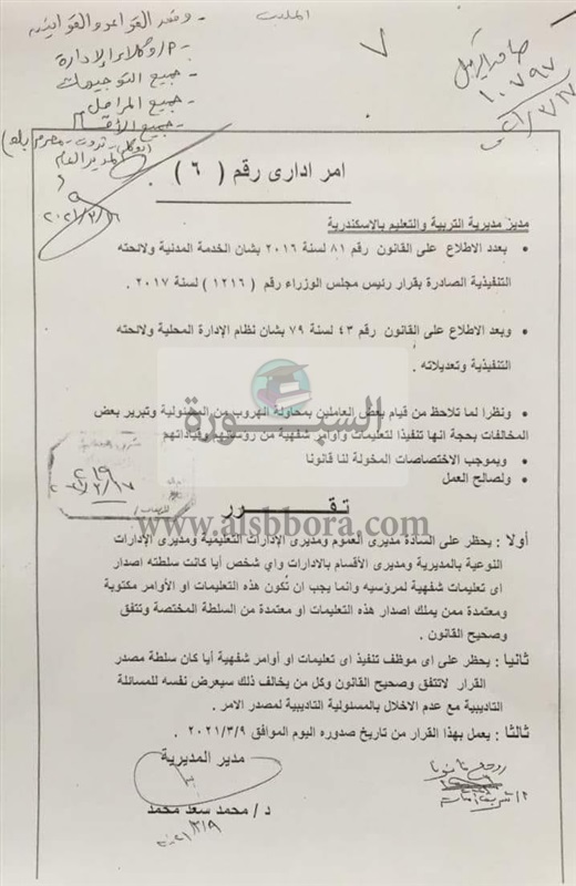 أصدرت مديرية التربية والتعليم والتعليم الفني في محافظة الإسكندرية؛ حظر مديرى العموم والادارات التعليمية ومديرى الإدارات النوعية بالمديرية ومديرى الأقسام اصدار أى تعليمات شفهية لمرؤسيه، مشددًا على ضرورة أن تكون هذة التعليمات أو الأوامر مكتوبة ومعتمدة ممن يملك إصدار هذه التعليمات ومعتمدة من السلطة المختصة تتفق وصحيح القانون