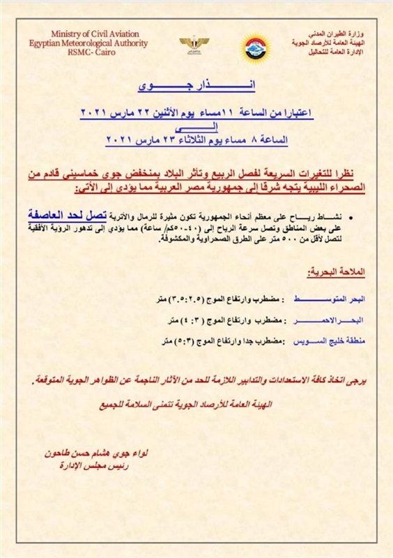 واكدت هيئة الارصاد الجوية، انه اعتبارا من الساعة الحادية عشر مساء امس الاثنين، الى الساعة الثامنة مساء اليوم الثلاثاء، ونظرا للتغيرات السريعة لفصل الربيع، وتأثر البلاد بمنخفض جوى خماسينى قادم من الصحراء الليبية، يتجه شرقا الى جمهورية مصر العربية، مما يؤدى الى نشاط رياح، على معظم انحاء الجمهورية، تكون مثيرة للرمال والاتربة، تصل لحد العاصفة على بعض المناطق، وتصل سرعة الرياح، من 40 الى 50 كيلو متر فى الساعة، مما يؤدى الى تدهور الرؤية الافقية، لتصل لاقل من 500 متر، على الطرق الصحراوية والمكشوفة.